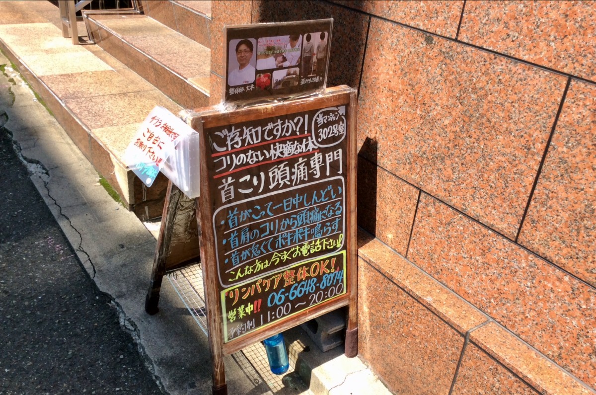 道標は、深江橋駅前整骨院 ⇒ カラオケ店 ⇒ 塩田ふとん店 ⇒ 歩道橋の信号交差点です