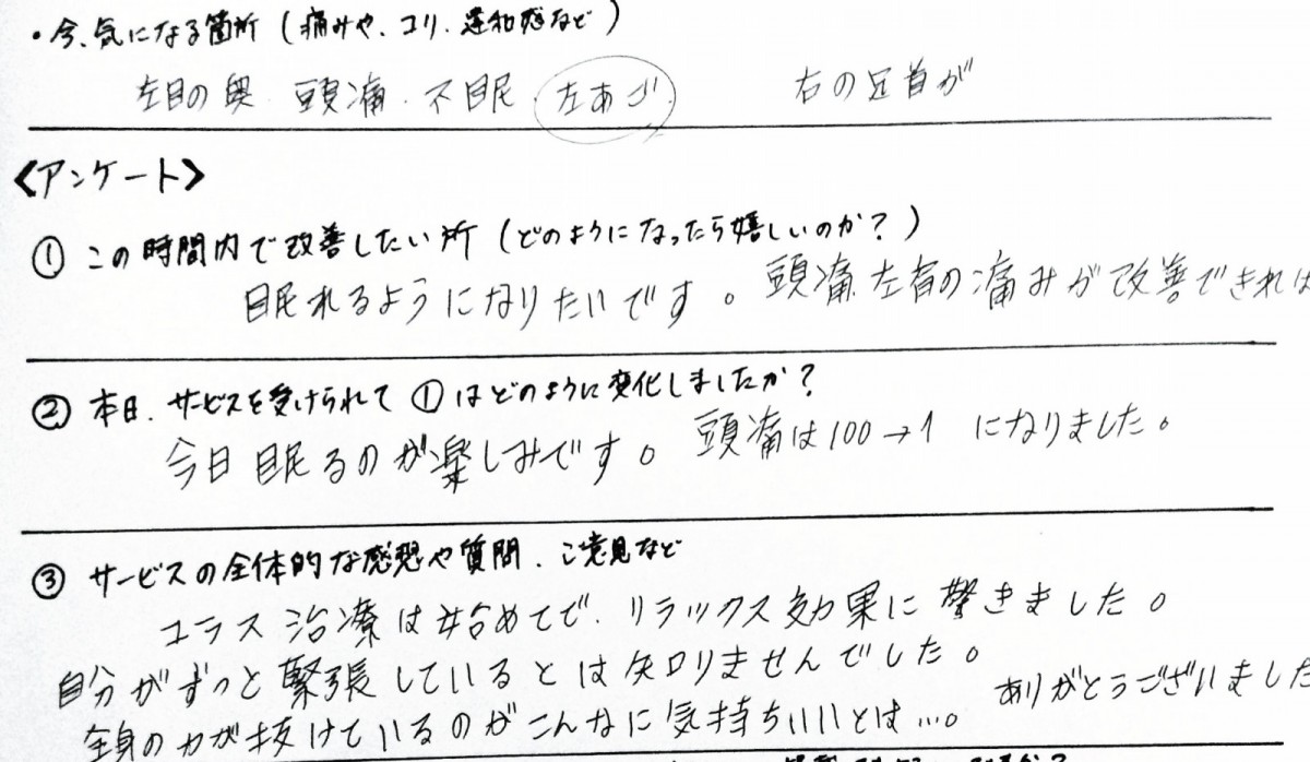 「頭痛(痛みの強さ)は 100 ⇒ 1になりました。今日眠るのが楽しみです」